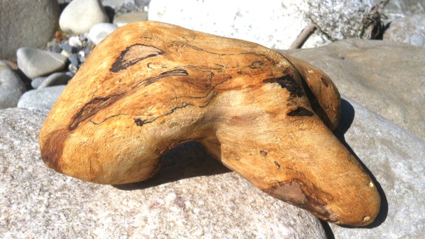 Die ursprüngliche Form erinnerte mich vage an die Venus von Willendorf, eine der ersten bekannten Venusfigurinen; diese kulturellen Errungenschaften faszinieren mich seit je. Sie gelten als (vermutlich religiöse) Fruchtbarkeitssymbole und auch die Frau im Holz wollte durch meine Hände in ihrer archaischen Form und Kraft als Frau dargestellt werden. Zug um Strich mit der Feile nahm das Holz immer mehr Gestalt an. Das zarte Schwemmholz zwang mich zu sehr sorgfältigem Einsatz der Kräfte und einem Vorgehen in mehreren Phasen.