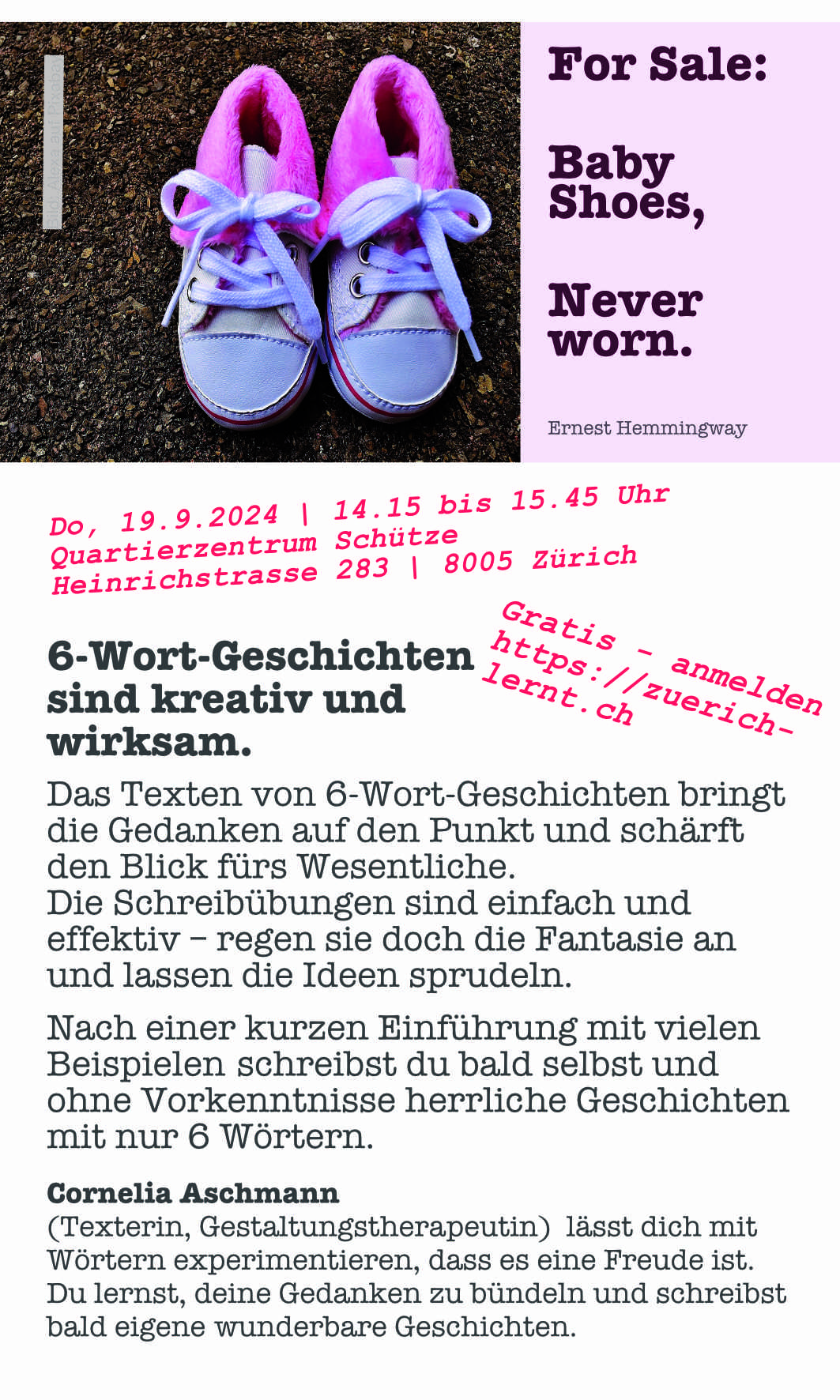 Wahr ist: Es braucht tatsächlich nicht mehr Worte, um das Kopfkino und das Gefühlspektrum des Lespublikums zu befeuern. Doch das Beste ist: Wir alle können 6-Wort-Geschichten schreiben. Literarische Häppchen zu jeder Lebenslage. Im Workshop, den ich im Rahmen der Züri-lernt-Woche zweite Hälfte September 2024 anbiete, lässt sich das lernen und üben. Auch warum eine Geschichte überzeugender ist als jene.