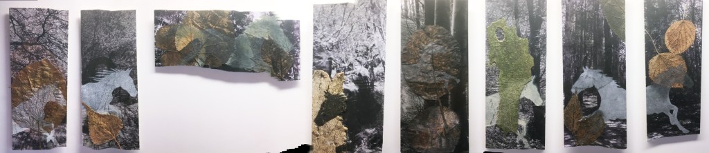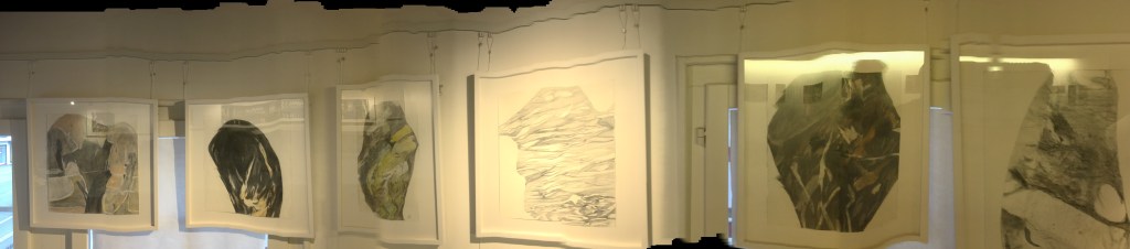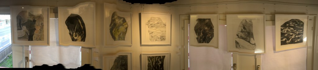 Aufgehängt und austariert – die Vernissage kann kommen. Es ist eine Freude, die Drucke in der Ausstellungsituation zu sehen und ich muss sagen, die Collagen der Drucke zeigen, dass ich auf dem richtigen Weg bin. Was wohl für Reaktionen kommen – in drei Stunden weiss ich mehr.
