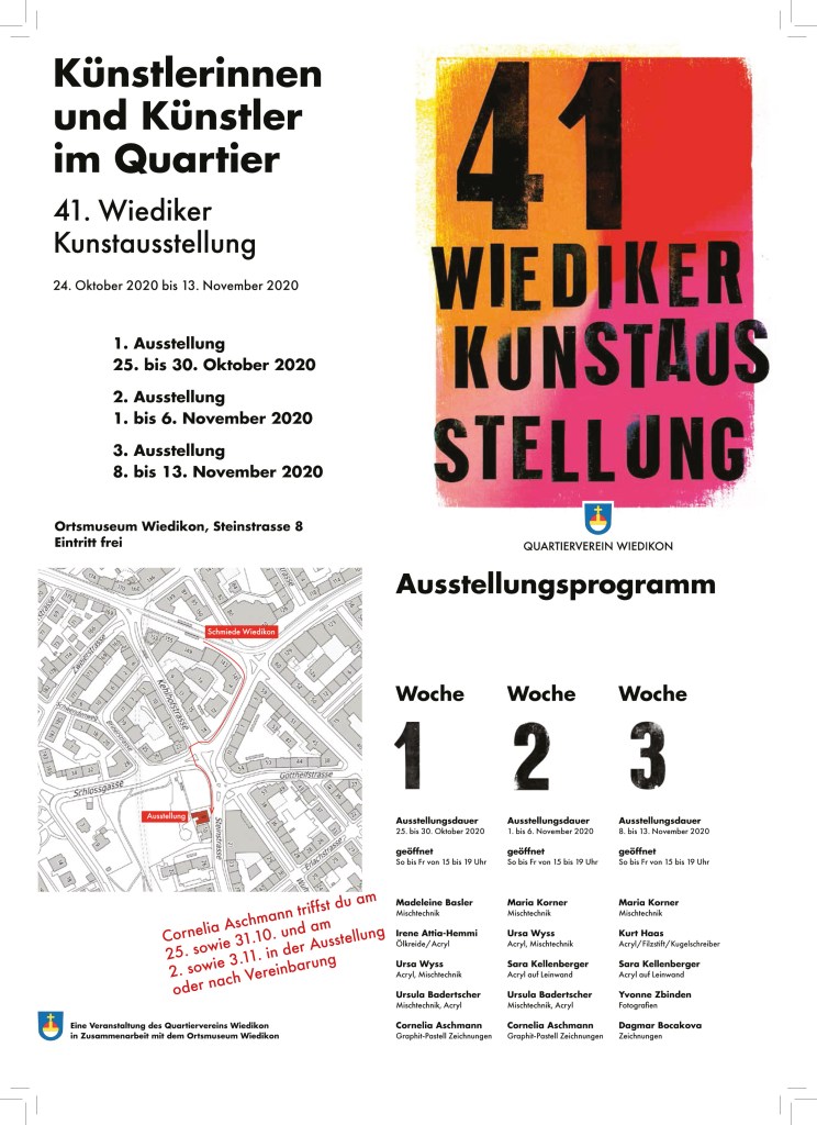Die 41. Ausstellung «Künstler im Quartier» im Ortsmuseum Wiedikon findet statt. Allerdings ist sie dieses Mal um eine Woche verkürzt, dafür hängen meine Werke zwei Wochen für interessierte Besucherinnen und Besucher bereit. Ich zeige eher kleinformate „Steinwerke“ und bringe natürlich auch die neuesten Kunstkarten mit.